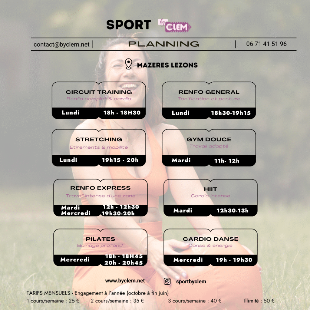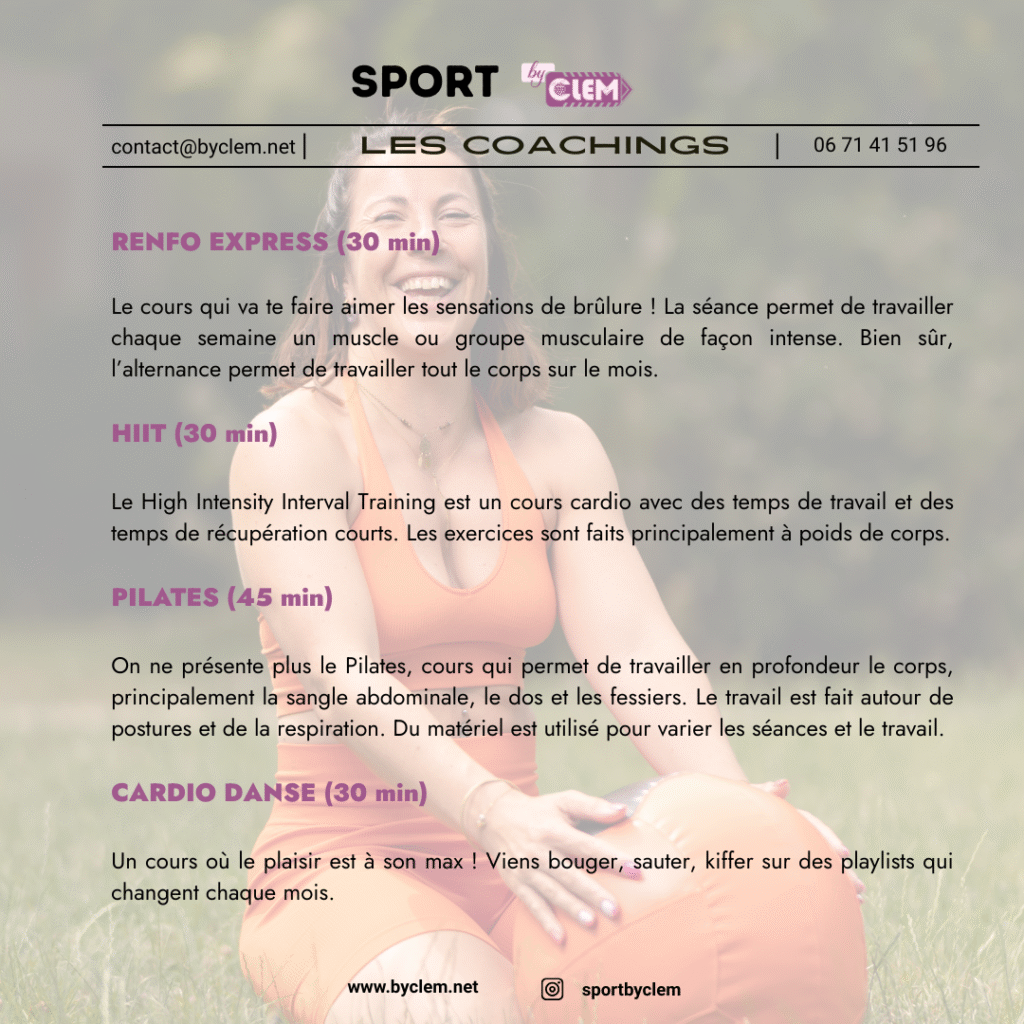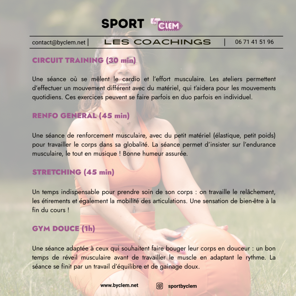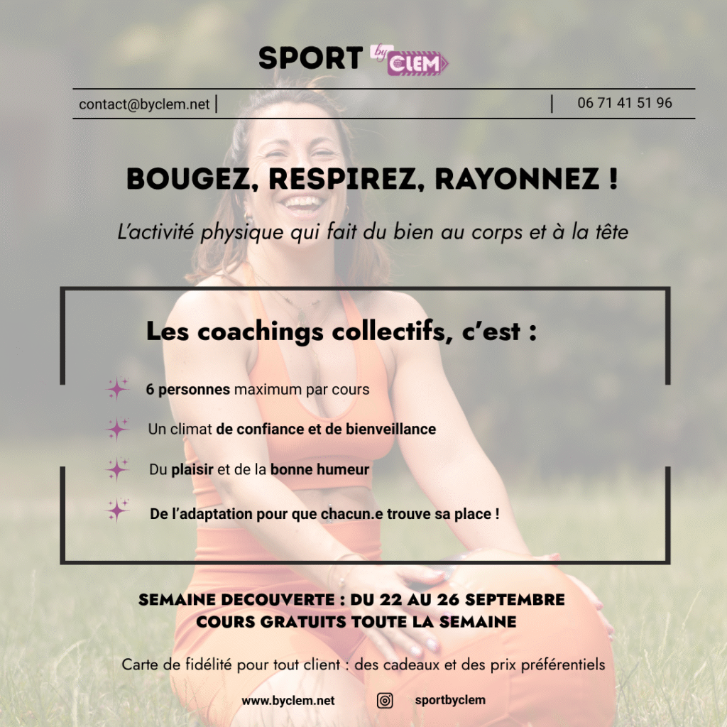 ByClem propose un accompagnement sportif très complet et un suivi des objectifs individuels très abouti. Entre recettes, conseils mindset, et verbalisation des ressentis après séance, notamment, coach Clem nous permet de réaliser de véritables actions pour nous faire progresser à bien des égards et analyser sa propre évolution de façon objective. Son sourire, sa bonne humeur et sa bienveillance rajoutent d'autant de raisons de cesser de se trouver des excuses et combattre la "flemme" de prendre (enfin) soin de soi ! Je recommande à 1000%.